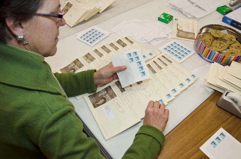 The first step in the process is affixing the mailing labels: